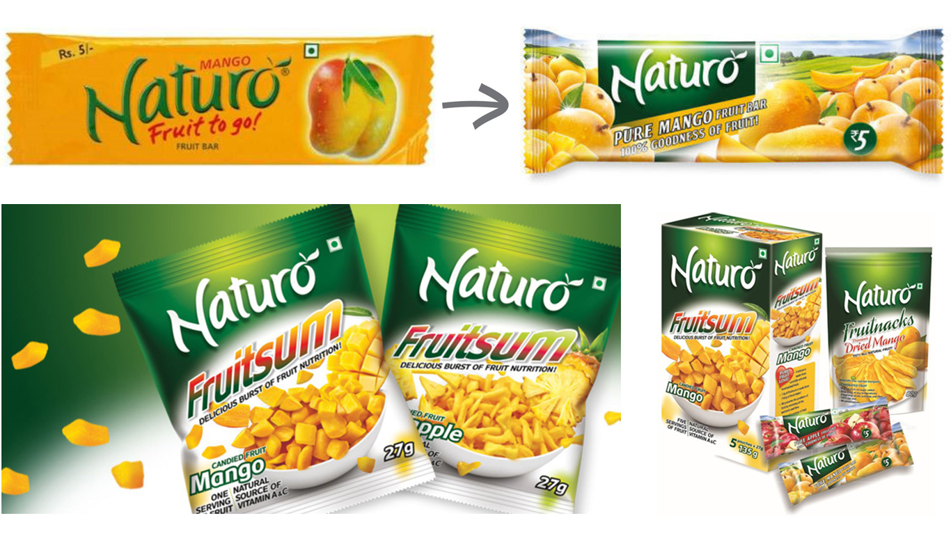 Naturo products. Visuals of fruits in abundance make the packaging look more appetizing